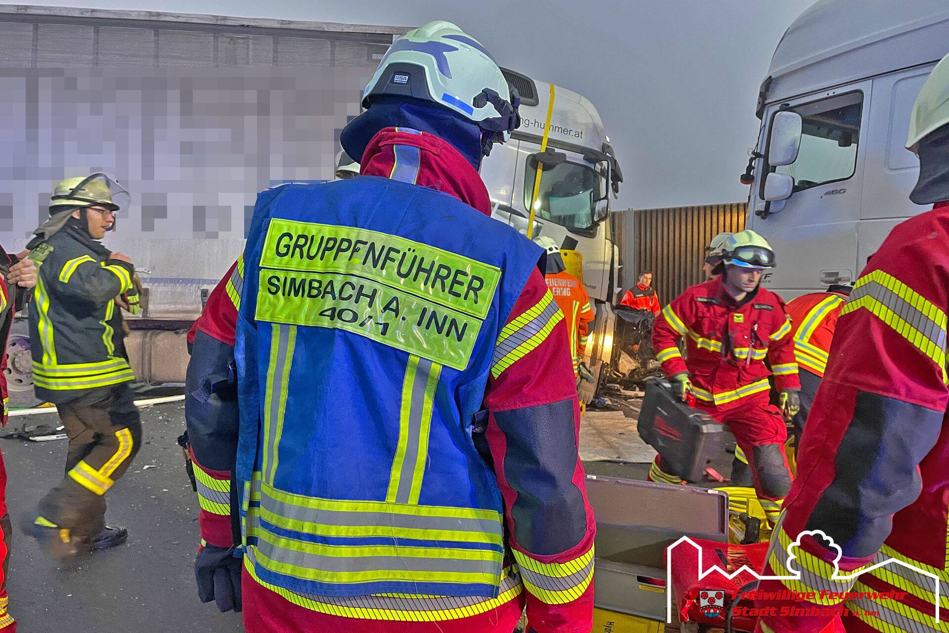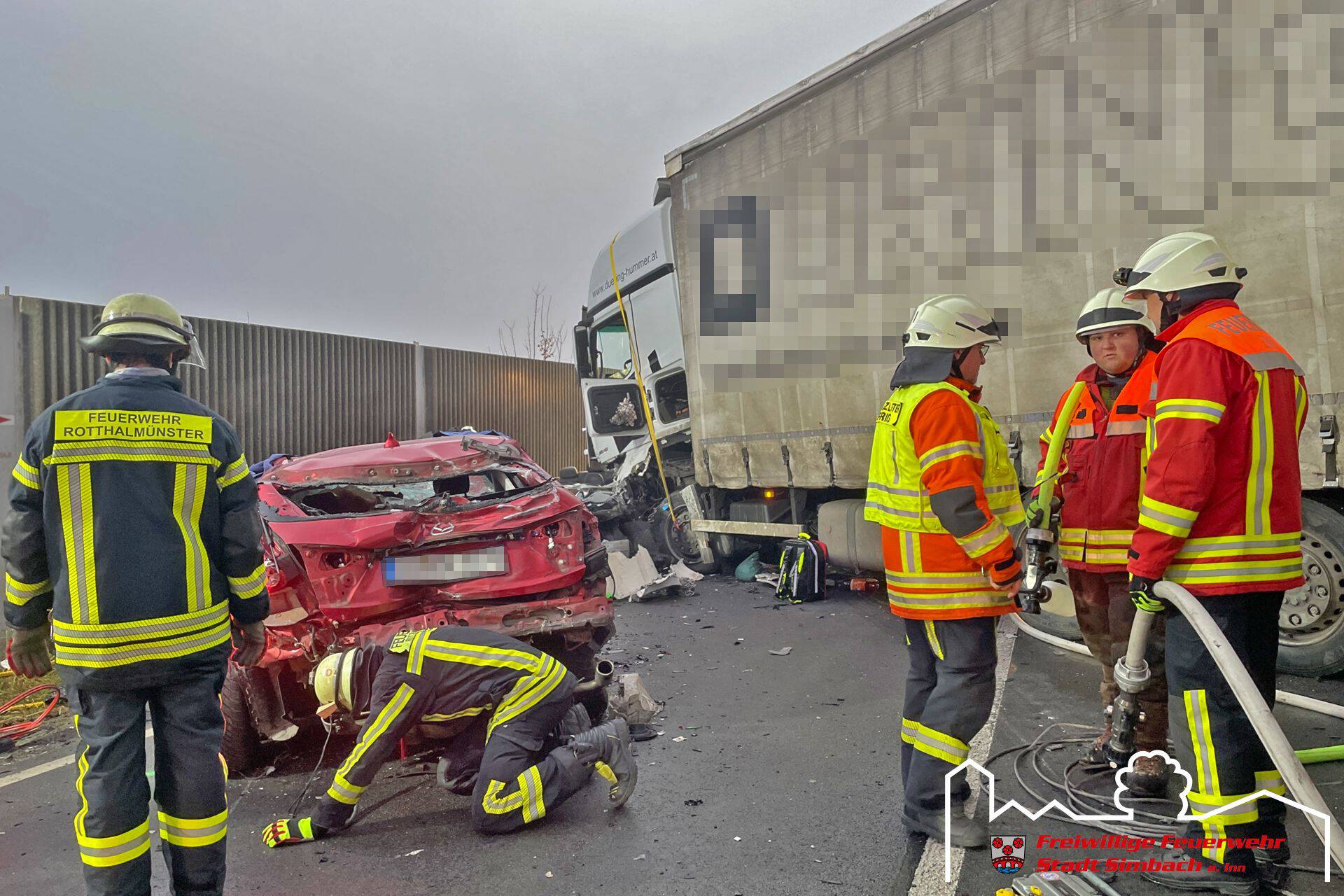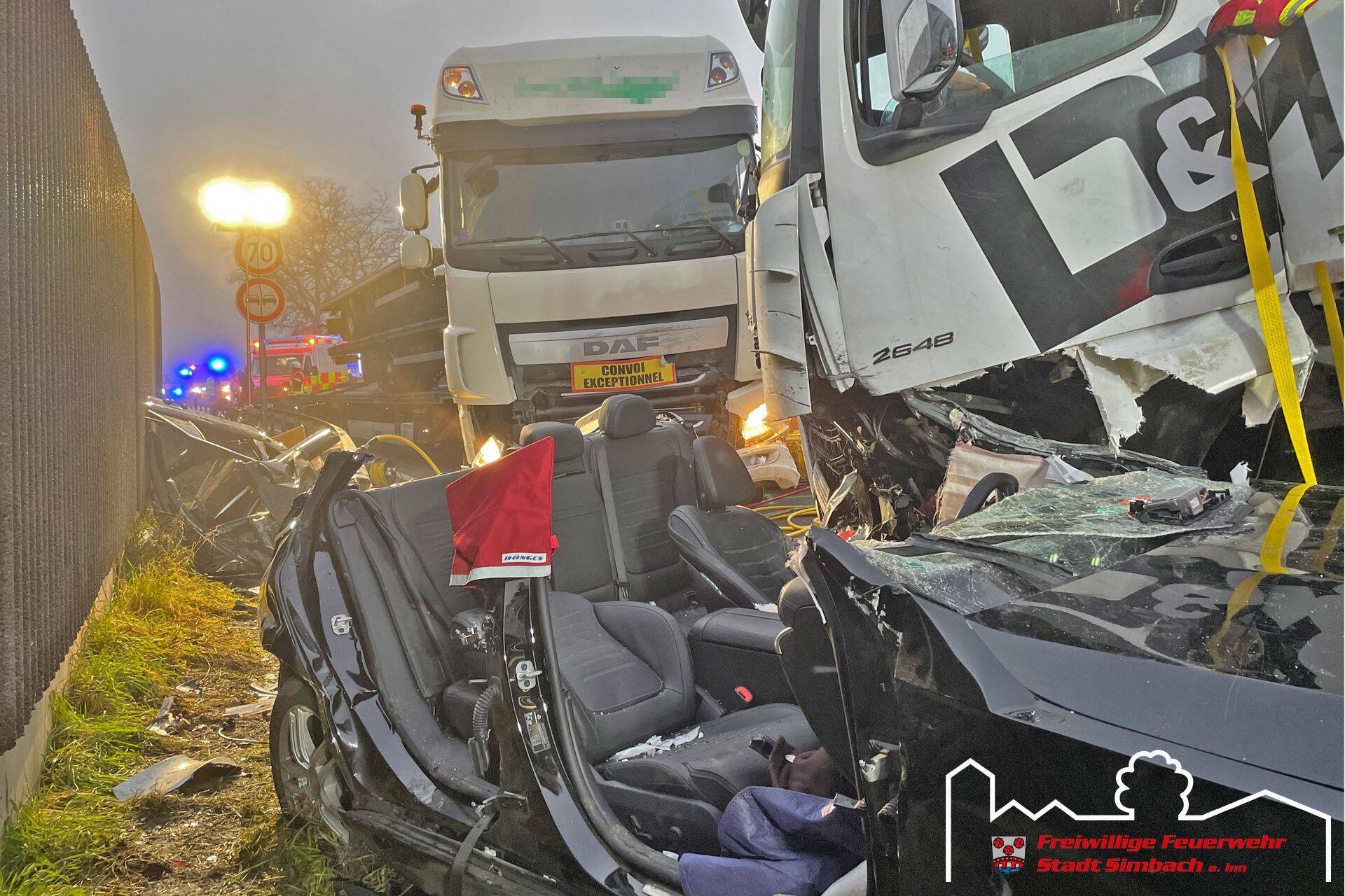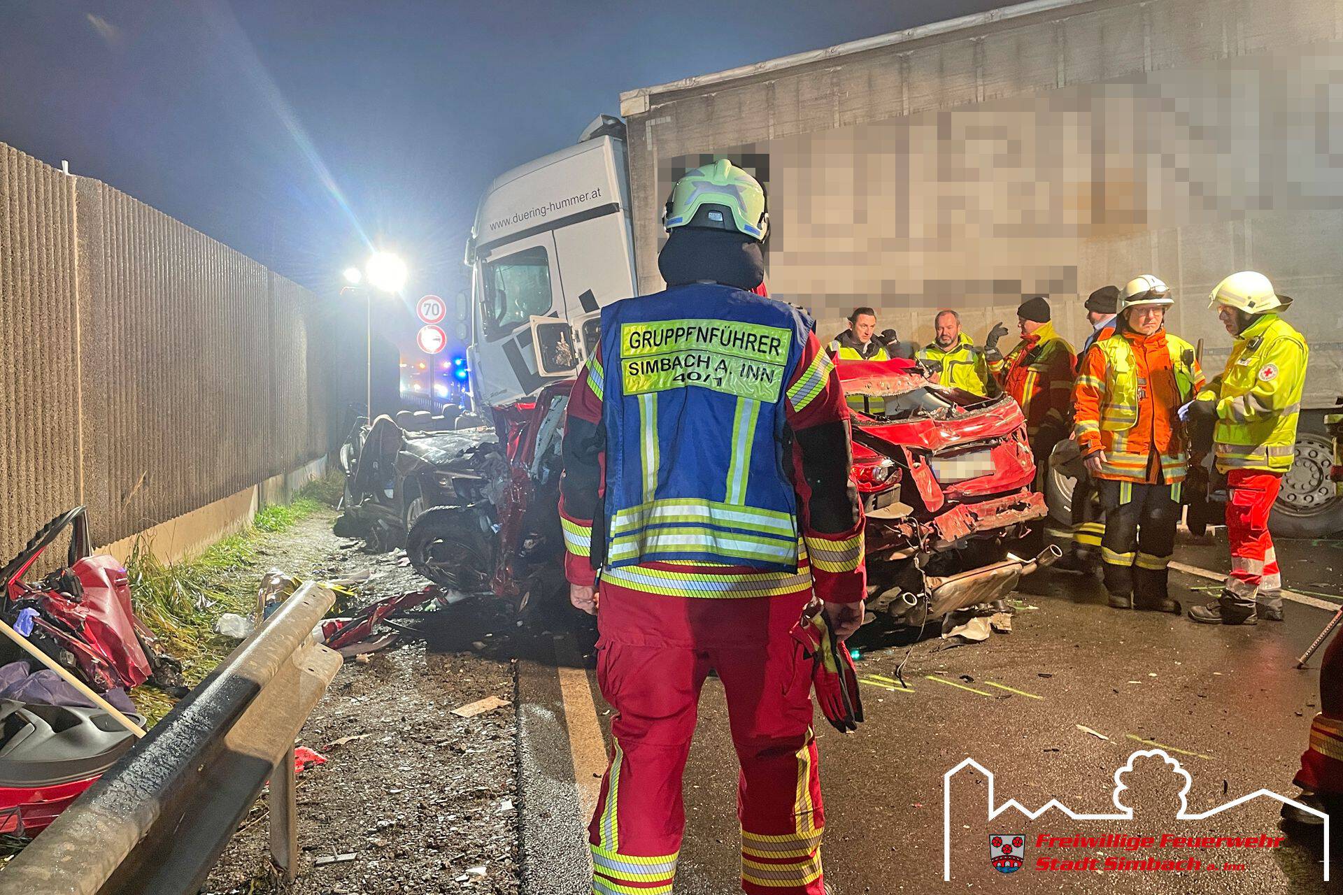 Am Mittwoch gegen 14.45 Uhr wurden wir gemeinsam mit zahlreichen weiteren Rettungskräften auf die B12 nach Ering gerufen, da dort Höhe Kühstein ein Verkehrsunfall mit mehreren eingeklemmten Personen gemeldet wurde. Die Lagemeldung der ersteintreffenden Kräfte bestätigte dies, da zwei LKWs und zwei PKWs beteiligt waren und in den beiden PKWs je eine Person eingeklemmt war. Leider stand zu diesem Zeitpunkt auch fest, dass für eine Person jede Hilfe zu spät kam, weshalb der Einsatzschwerpunkt auf der Rettung des zweiten massiv eingeklemmten Fahrers lag. Da sich das Fahrzeug zwischen LKW und Leitplanke befand, entfernten wir die Leitplanke mittels Motortrennschleifer, um zum Fahrzeug zu gelangen. Anschließend schufen wir eine große Seitenöffnung, entfernten das Dach und schoben das Fahrzeug mittels Spreizer vom LKW weg, bevor der Patient mittels Spineboard gerettet werden konnte und an den Rettungsdienst übergeben wurde. Da der Fahrer massiv eingeklemmt war, dauerte es etwa eine Stunde, bis dieser befreit werde konnte. Nach Abschluss der Arbeiten des Gutachters standen wir noch in Bereitstellung, während die Eringer Kameraden die Bergung der verstorbenen Person aus dem zweiten Fahrzeug übernahmen. Während des Einsatzes stellten wir mit unserem Einsatzleitwagen die Führungsunterstützung für den Einsatzleiter aus Ering. Nach etwa vier Stunden konnten wir wieder einrücken, die örtlich zuständigen Kräfte waren jedoch noch längere Zeit an der Einsatzstelle gebunden.