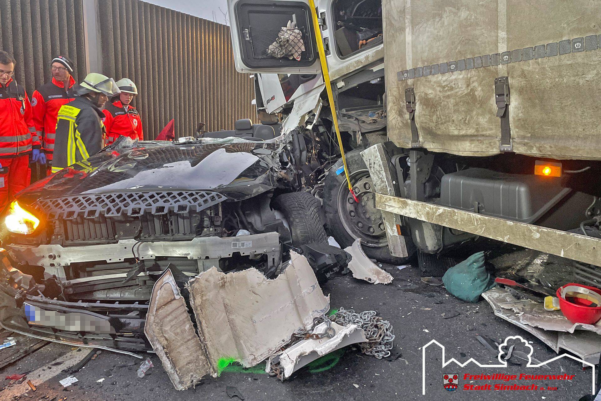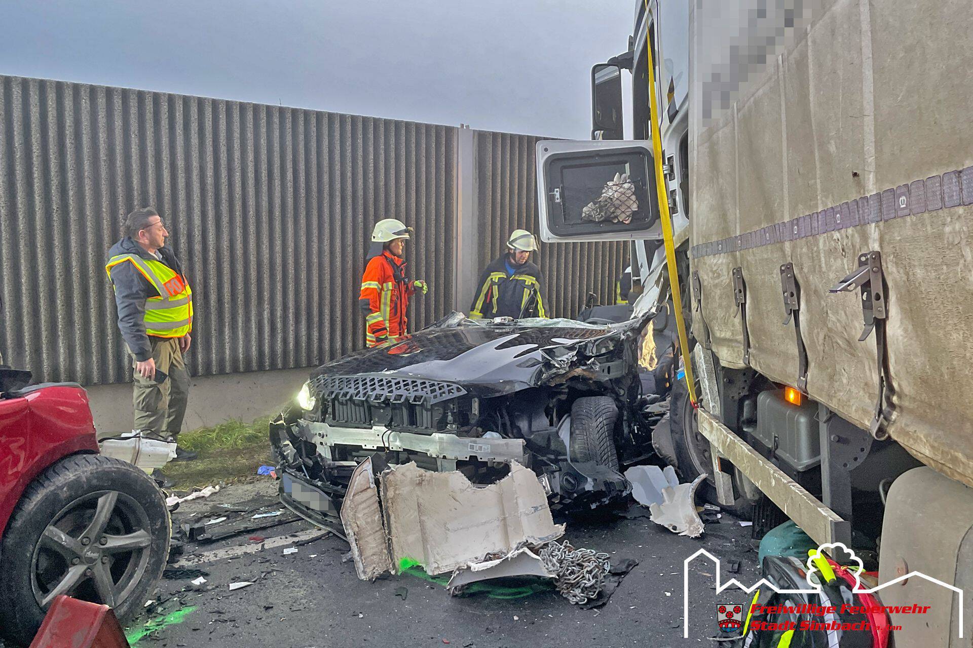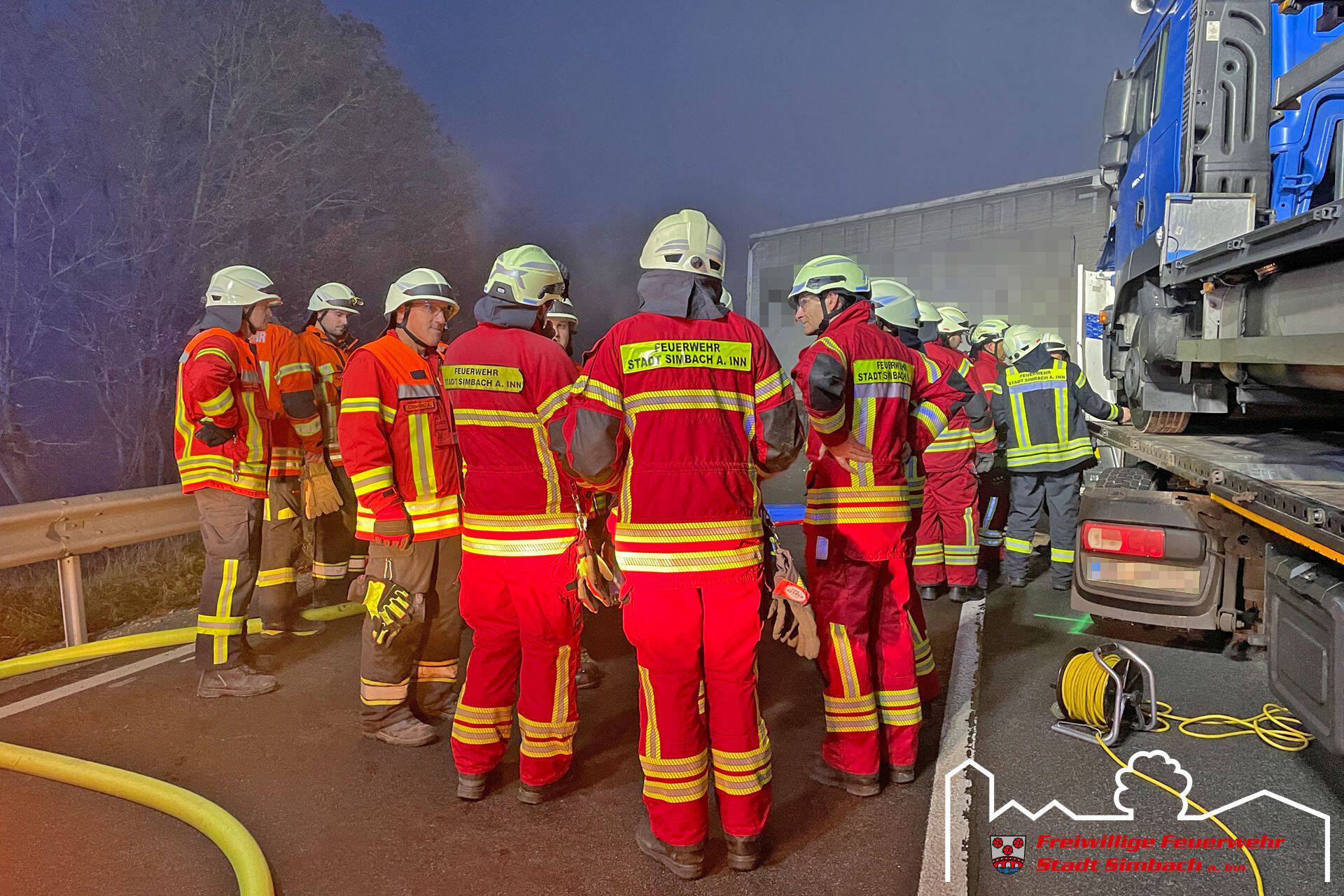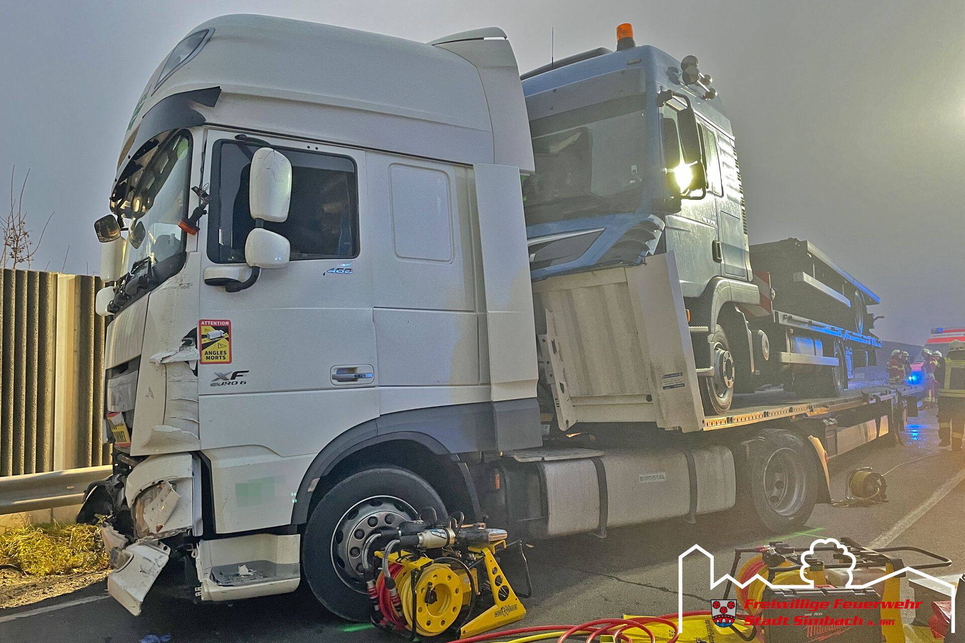 Am Mittwoch gegen 14.45 Uhr wurden wir gemeinsam mit zahlreichen weiteren Rettungskräften auf die B12 nach Ering gerufen, da dort Höhe Kühstein ein Verkehrsunfall mit mehreren eingeklemmten Personen gemeldet wurde. Die Lagemeldung der ersteintreffenden Kräfte bestätigte dies, da zwei LKWs und zwei PKWs beteiligt waren und in den beiden PKWs je eine Person eingeklemmt war. Leider stand zu diesem Zeitpunkt auch fest, dass für eine Person jede Hilfe zu spät kam, weshalb der Einsatzschwerpunkt auf der Rettung des zweiten massiv eingeklemmten Fahrers lag. Da sich das Fahrzeug zwischen LKW und Leitplanke befand, entfernten wir die Leitplanke mittels Motortrennschleifer, um zum Fahrzeug zu gelangen. Anschließend schufen wir eine große Seitenöffnung, entfernten das Dach und schoben das Fahrzeug mittels Spreizer vom LKW weg, bevor der Patient mittels Spineboard gerettet werden konnte und an den Rettungsdienst übergeben wurde. Da der Fahrer massiv eingeklemmt war, dauerte es etwa eine Stunde, bis dieser befreit werde konnte. Nach Abschluss der Arbeiten des Gutachters standen wir noch in Bereitstellung, während die Eringer Kameraden die Bergung der verstorbenen Person aus dem zweiten Fahrzeug übernahmen. Während des Einsatzes stellten wir mit unserem Einsatzleitwagen die Führungsunterstützung für den Einsatzleiter aus Ering. Nach etwa vier Stunden konnten wir wieder einrücken, die örtlich zuständigen Kräfte waren jedoch noch längere Zeit an der Einsatzstelle gebunden.