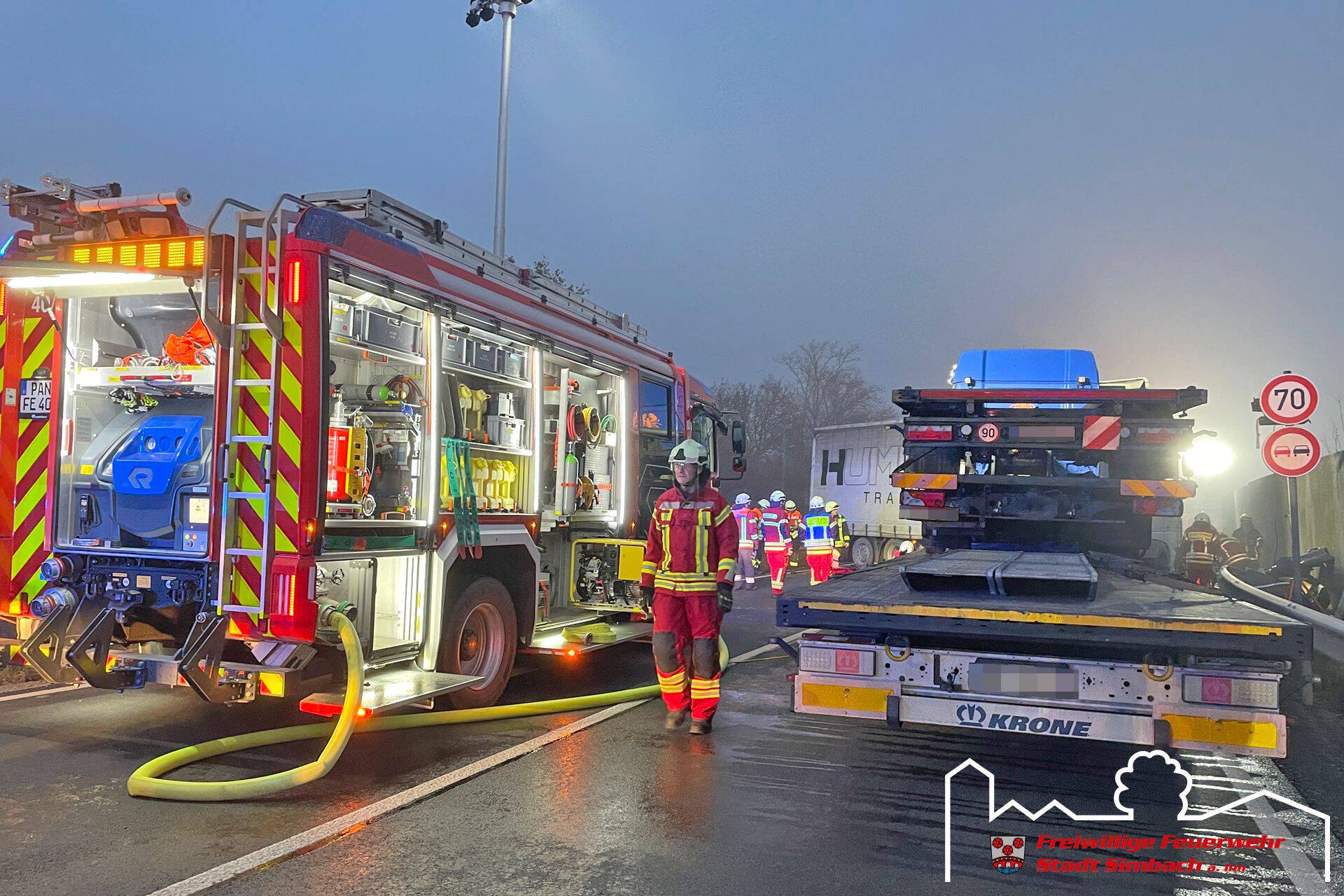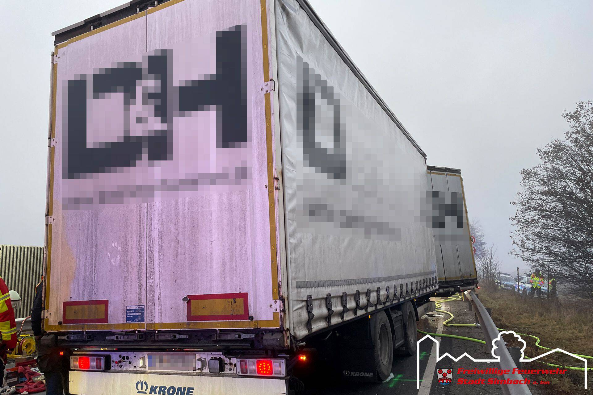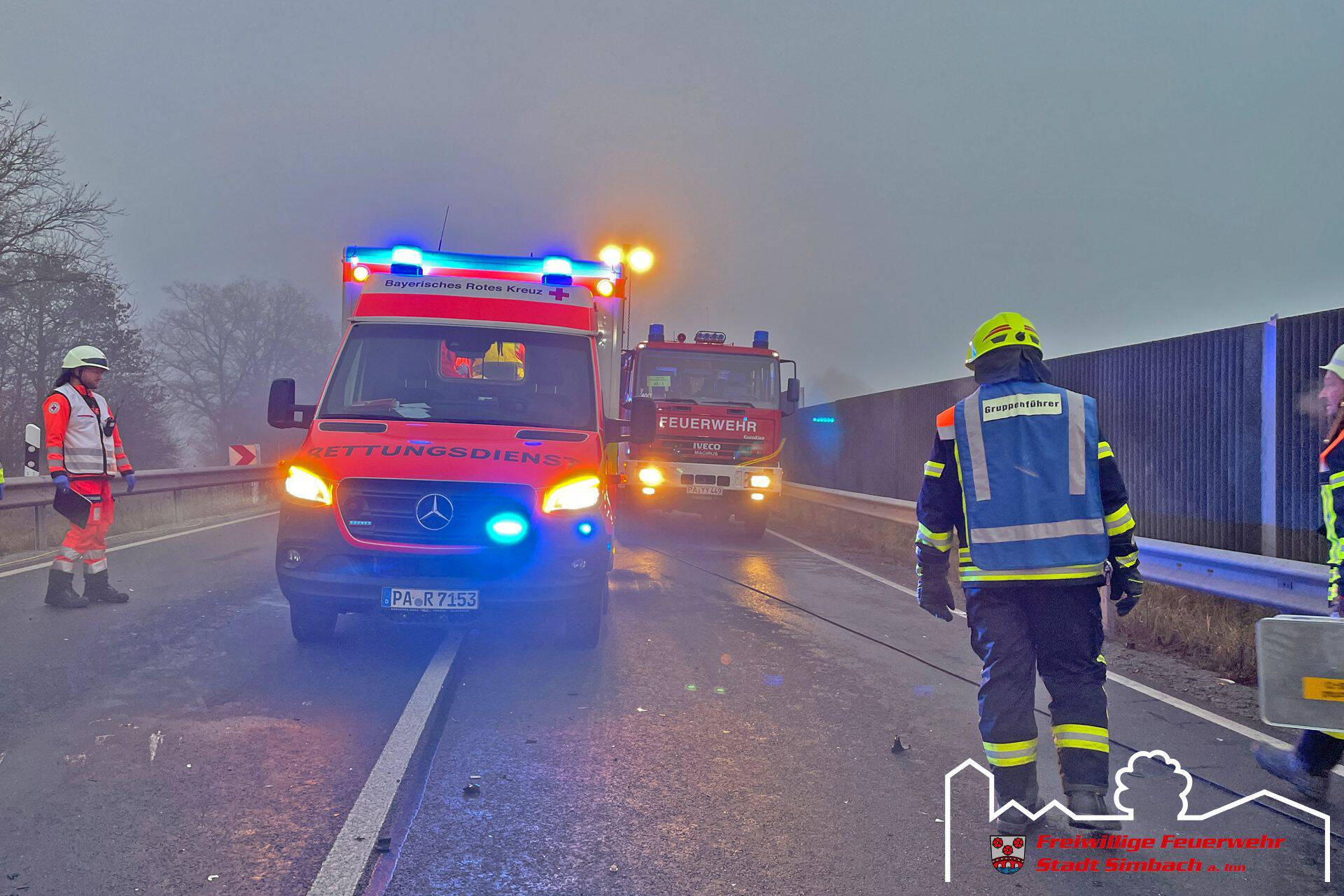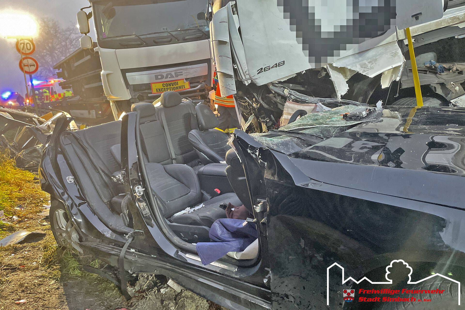 Am Mittwoch gegen 14.45 Uhr wurden wir gemeinsam mit zahlreichen weiteren Rettungskräften auf die B12 nach Ering gerufen, da dort Höhe Kühstein ein Verkehrsunfall mit mehreren eingeklemmten Personen gemeldet wurde. Die Lagemeldung der ersteintreffenden Kräfte bestätigte dies, da zwei LKWs und zwei PKWs beteiligt waren und in den beiden PKWs je eine Person eingeklemmt war. Leider stand zu diesem Zeitpunkt auch fest, dass für eine Person jede Hilfe zu spät kam, weshalb der Einsatzschwerpunkt auf der Rettung des zweiten massiv eingeklemmten Fahrers lag. Da sich das Fahrzeug zwischen LKW und Leitplanke befand, entfernten wir die Leitplanke mittels Motortrennschleifer, um zum Fahrzeug zu gelangen. Anschließend schufen wir eine große Seitenöffnung, entfernten das Dach und schoben das Fahrzeug mittels Spreizer vom LKW weg, bevor der Patient mittels Spineboard gerettet werden konnte und an den Rettungsdienst übergeben wurde. Da der Fahrer massiv eingeklemmt war, dauerte es etwa eine Stunde, bis dieser befreit werde konnte. Nach Abschluss der Arbeiten des Gutachters standen wir noch in Bereitstellung, während die Eringer Kameraden die Bergung der verstorbenen Person aus dem zweiten Fahrzeug übernahmen. Während des Einsatzes stellten wir mit unserem Einsatzleitwagen die Führungsunterstützung für den Einsatzleiter aus Ering. Nach etwa vier Stunden konnten wir wieder einrücken, die örtlich zuständigen Kräfte waren jedoch noch längere Zeit an der Einsatzstelle gebunden.