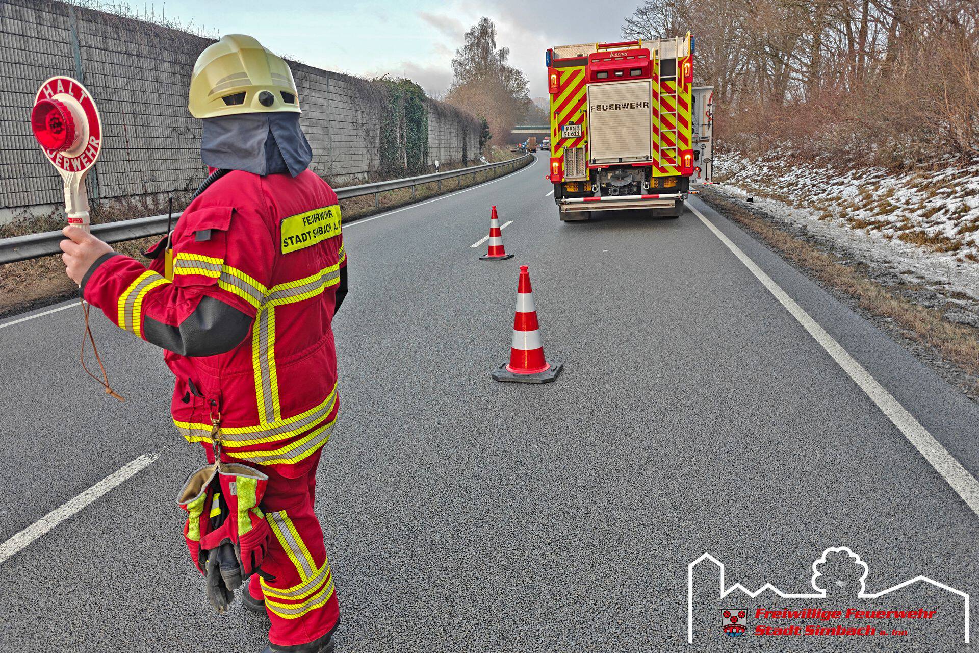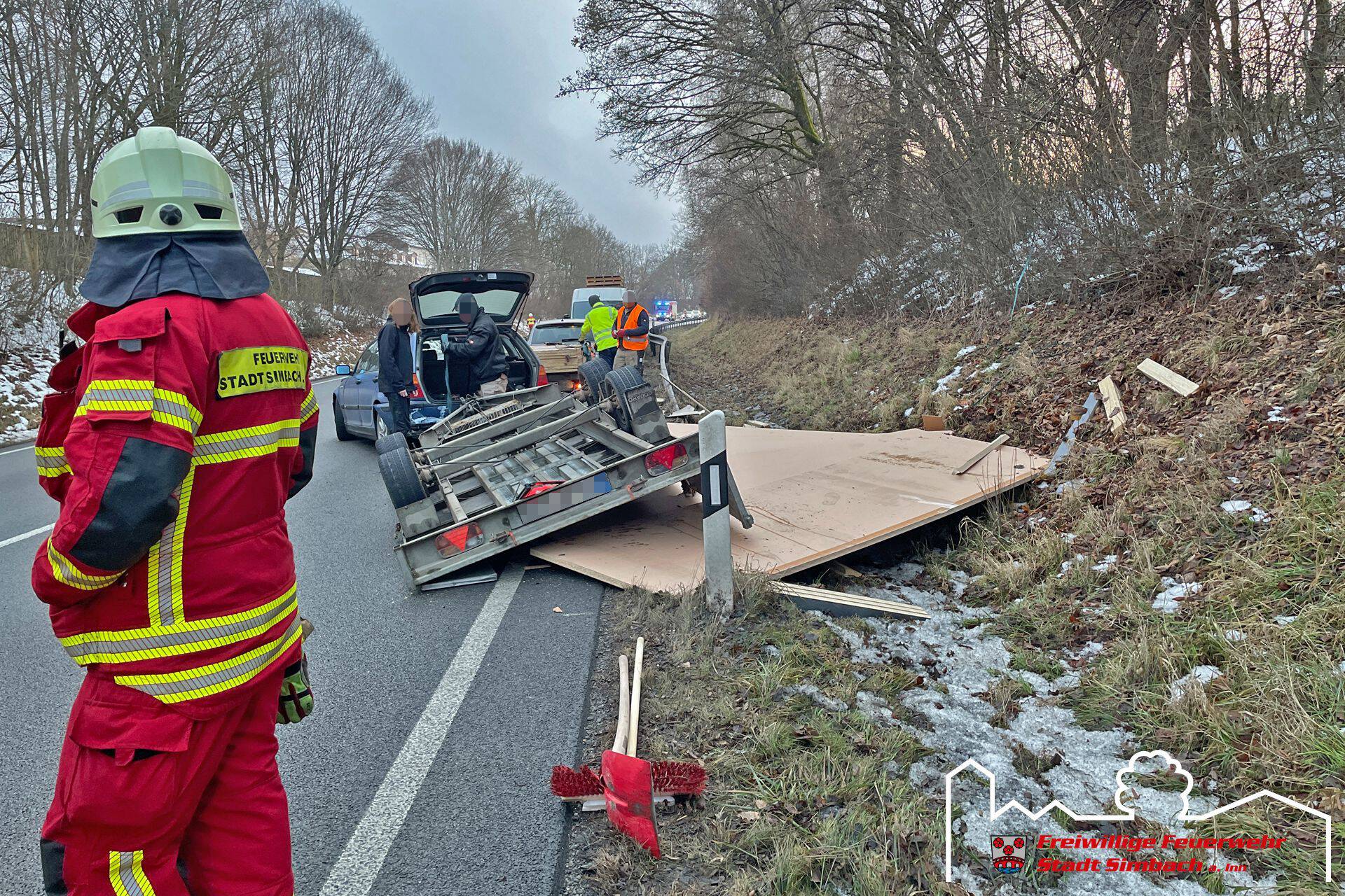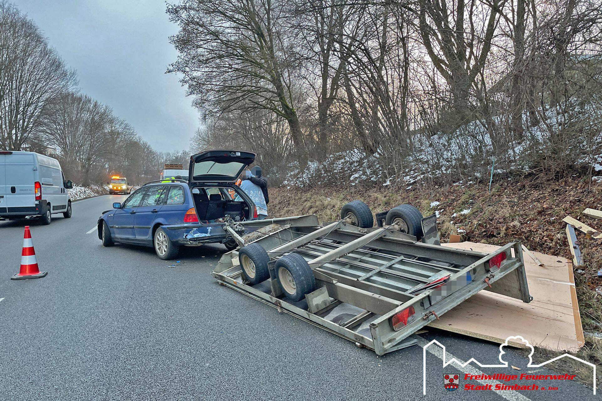 Am Freitag gegen 15.30 Uhr wurden wir zum zweiten Einsatz an diesem Tag gerufen, wobei es sich um einen Verkehrsunfall auf der B12 handelte. Als wir am Einsatzort Höhe unseres Feuerwehrhauses eintrafen, stellte sich heraus, dass ein mit mehreren Holzplatten beladenes PKW-Anhängergespann alleinbeteiligt verunfallte und keine Betriebsstoffe austraten. Der Rettungsdienst kümmerte sich zu diesem Zeitpunkt bereits um die beteiligten Personen. Somit konzentrierten sich unsere Maßnahmen auf die Verkehrsabsicherung und wir leiteten den Verkehr bis zum Eintreffen des Abschleppdienstes wechselseitig an der Unfallstelle vorbei. Währenddessen wurden wir durch die ILS über einen Paralleleinsatz informiert, weshalb unser HLF kurzzeitig von der Einsatzstelle entbunden wurde. Nachdem der Abschleppdienst an der Unfallstelle eingetroffen war, wurde die Bundesstraße in der Zeit der Bergemaßnahmen komplett für den Verkehr gesperrt. Im Anschluss an diese Arbeiten konnten wir wieder ins Gerätehaus zurückkehren.