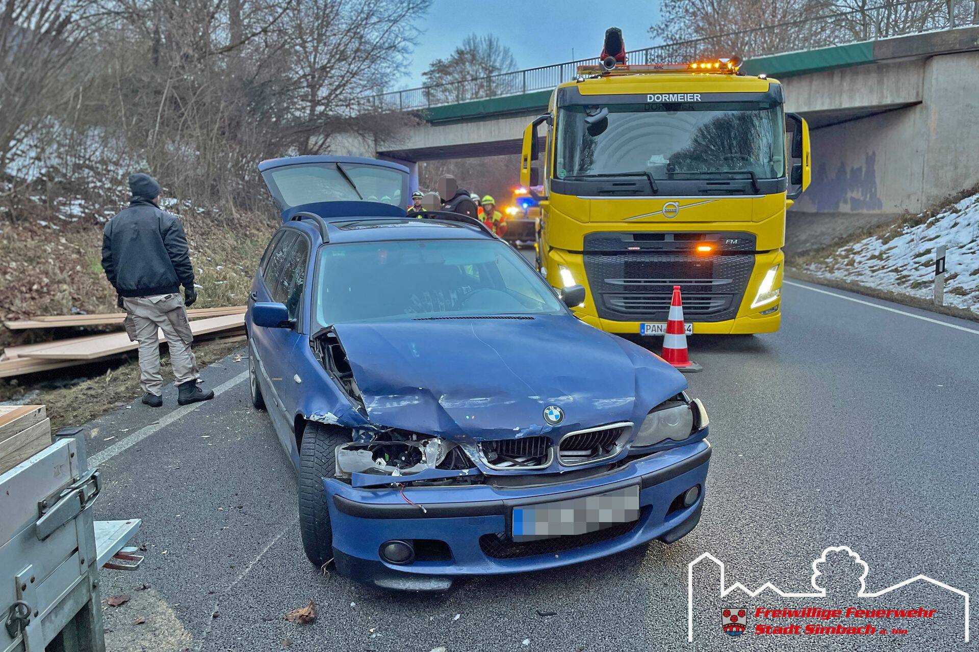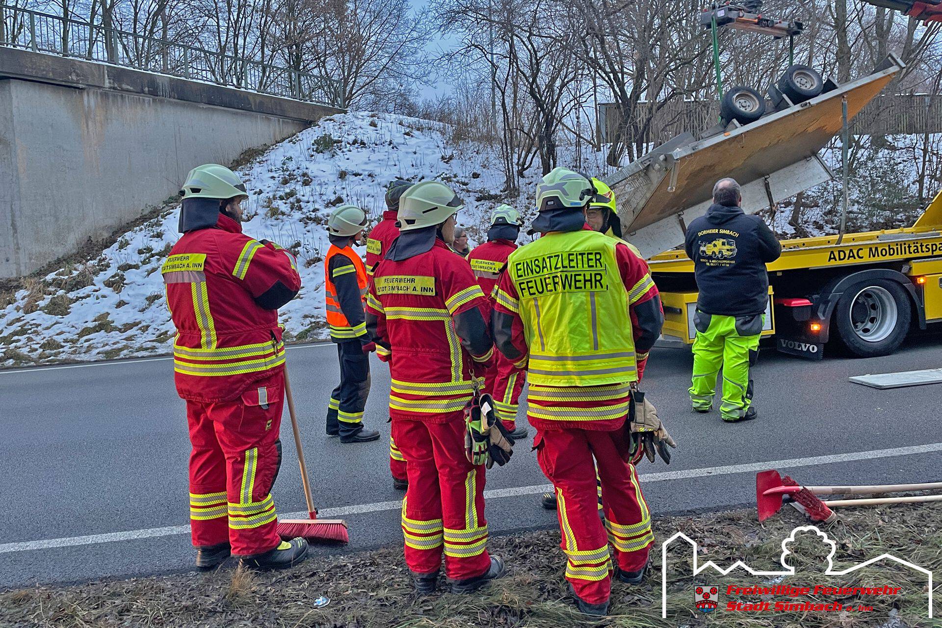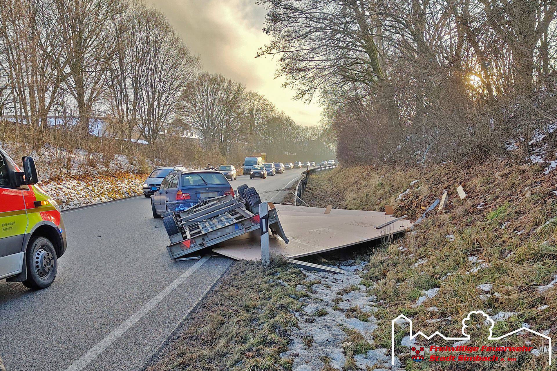 Am Freitag gegen 15.30 Uhr wurden wir zum zweiten Einsatz an diesem Tag gerufen, wobei es sich um einen Verkehrsunfall auf der B12 handelte. Als wir am Einsatzort Höhe unseres Feuerwehrhauses eintrafen, stellte sich heraus, dass ein mit mehreren Holzplatten beladenes PKW-Anhängergespann alleinbeteiligt verunfallte und keine Betriebsstoffe austraten. Der Rettungsdienst kümmerte sich zu diesem Zeitpunkt bereits um die beteiligten Personen. Somit konzentrierten sich unsere Maßnahmen auf die Verkehrsabsicherung und wir leiteten den Verkehr bis zum Eintreffen des Abschleppdienstes wechselseitig an der Unfallstelle vorbei. Währenddessen wurden wir durch die ILS über einen Paralleleinsatz informiert, weshalb unser HLF kurzzeitig von der Einsatzstelle entbunden wurde. Nachdem der Abschleppdienst an der Unfallstelle eingetroffen war, wurde die Bundesstraße in der Zeit der Bergemaßnahmen komplett für den Verkehr gesperrt. Im Anschluss an diese Arbeiten konnten wir wieder ins Gerätehaus zurückkehren.